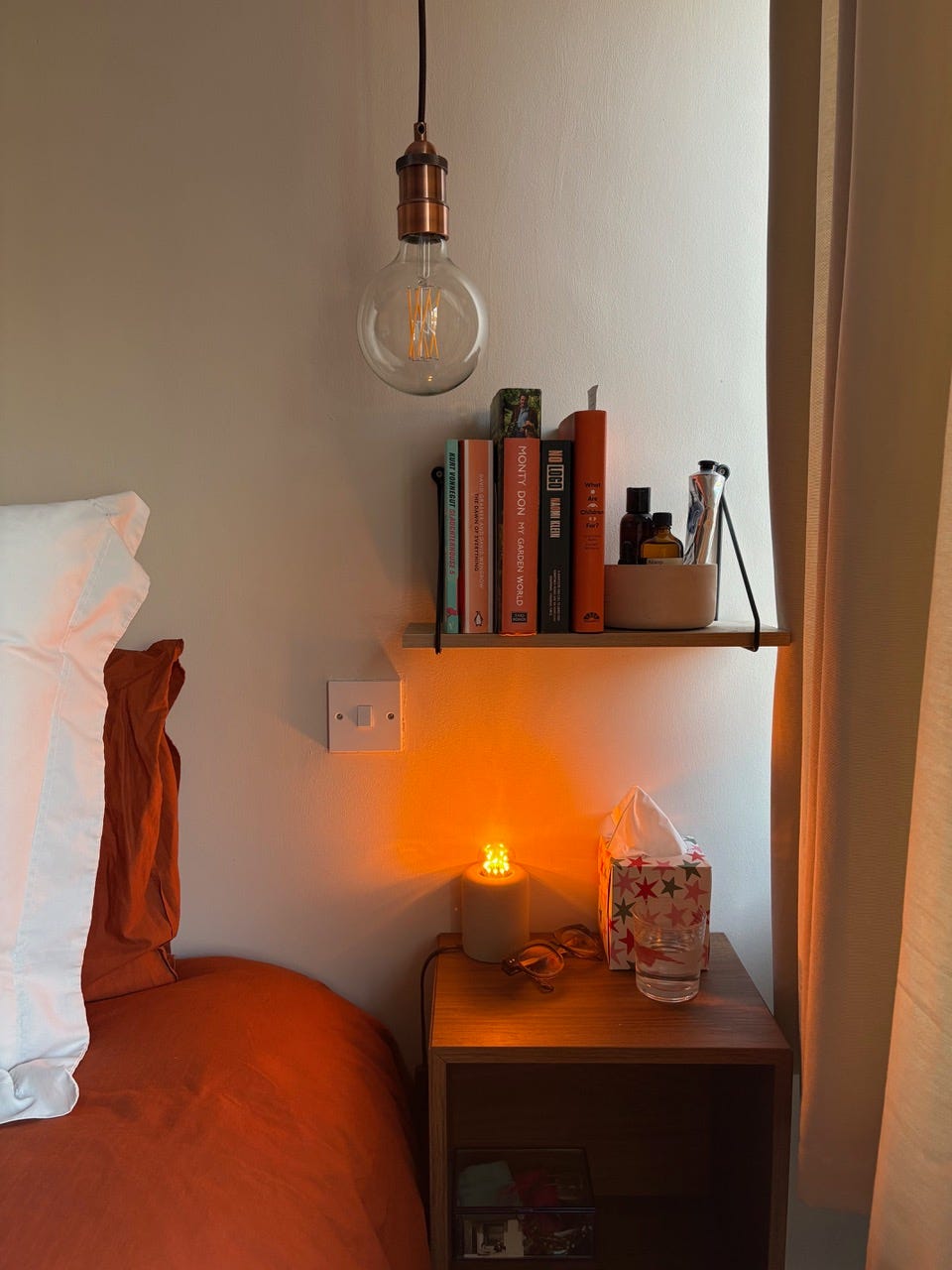 I do not sleep with my phone next to me, and I can’t believe that some people do! My nervous system can’t handle it. I have a dim light for reading, my glasses, tissues, a glass of water, and then I have a dedicated bedtime bookshelf which I really recommend.